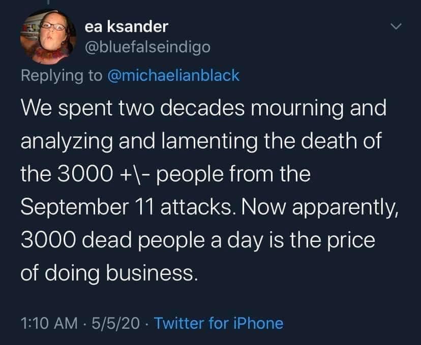 A thorn-in-the-side I am… I’ve never learned to dissemble and pretend matters of life-and-death aren’t real, which irritates the stuffing out of people. Everything’s SURreal – in the middle of a plague that requires social-guideline cooperation from the global community, Americans are now SOLDIERS, fighting a WAR, and we must buck up and march into the maw – who do you think makes billionaires their money, for goodness sake?