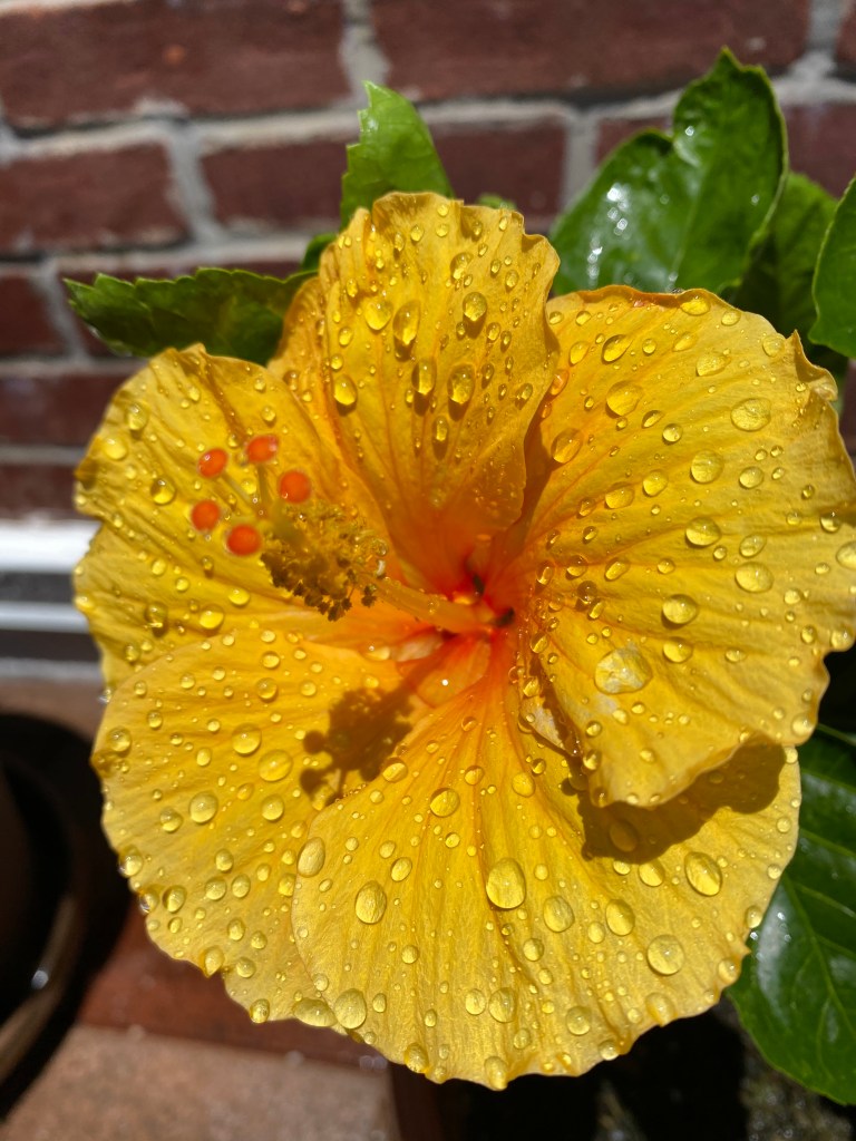 A friendly rain shower was in progress when I got up at 6am, but between 4 and 5 o’clock there was a windstorm here with some sort of downburst and 2″ of rain. Our pretty little tree outside the east entrance is broken in half, our deck furniture was shuffled around and tumped over, and all the flowers on our balcony and the rooftop deck took a beating. We were blissfully unaware until after we’d enjoyed our Saturday Breakfast… but everything will recover, with the likely exception of the tree… and the rain is nice. The photo above is one of Kim’s hibiscus blooms – before the storm.