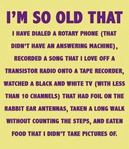 That’s not even the half of it. I’ve “dialed” a wood-encased crank phone on the wall – our ring was one long, three shorts. My playlist back in the day, before transistors and recorders, came from Les Paul & Mary Ford 45rpms spun on a 32-volt player because we had to generate our own electricity on the farm via a windmill and a wall of batteries until rural electrification finally came along and changed everything. Our tiny black & white TV didn’t show up ’til I was in 6th grade and we had one channel, mostly snow, and a max of three channels in the end. Out there in the country, we didn’t know steps were for counting – they just got us from here to there while we blew the stink off. I see food as legitimate art, but nobody told us we were supposed to be documenting it in photos, so the world missed seeing some killer hotdogs and salmon cakes.