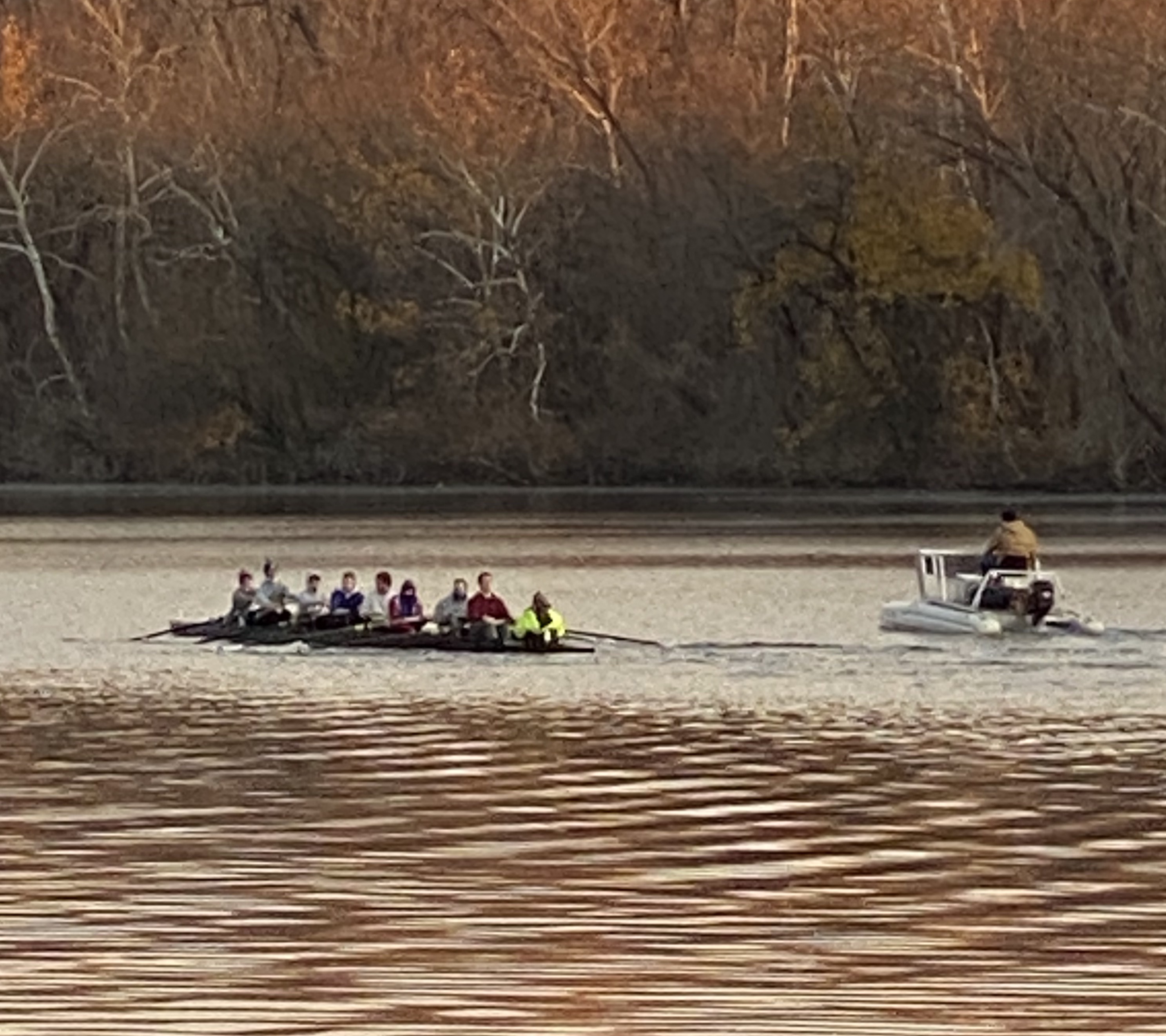 It’s chilly to cold and winter’s setting in, week by week, and with virus numbers on fire across the country, Lawrence Sports Pavilion won’t be opening again any time soon. That means Kimmers will be cooped up for weeks on end in a place he knows like his own pores, with mostly frosty walks and trips upstairs to the workout room to break up the ennui. Yikes. Good thing he likes reading, research, selective TV, and cold morning walks. He trekked to the Boathouse again early this morning and caught a better shot of one of the rowing crews.