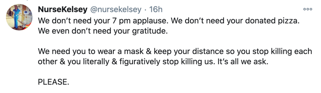 Instead, because conspiracy theorists and grumpy-ass naysayers politicized a virus and the idea of protecting ourselves against it, America is in the middle of a humanitarian crisis that’s spiraling out of control. We have a medical system that’s overburdened across the nation and personnel who are burnt beyond even talking about it.