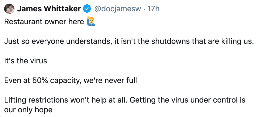 We’re losing a 9/11’s worth of American lives every two days, and soon it will be 2,000+ people every single day. That should be a difficult statistic for even the most jaded among us. They’re running out of refrigerated morgue trucks in El Paso, turning away car accident victims at Utah hospitals, burying entire populations of nursing homes plus their caregivers, repeated ad infinitum across the nation. Aside from our temporary lost standing in the world, the racial injustice and warfare in our streets, and the wreckage of our economy, a non-response to a global pandemic, with its resulting carnage, seems a very high price to pay for the demand to be right and make the liberals cry.