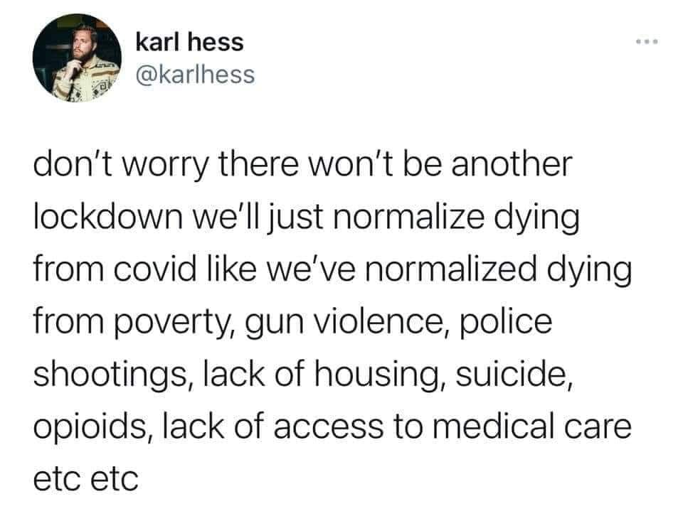 The general populace needn’t sweat it, though, the world isn’t about to shut down again. Been there, did a half-assed job of it, not going back.