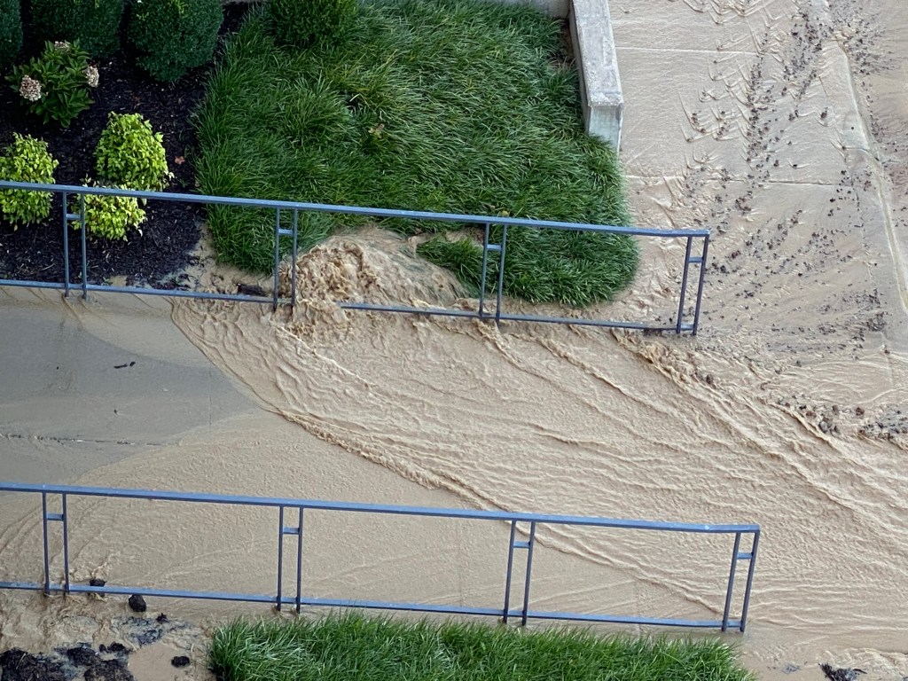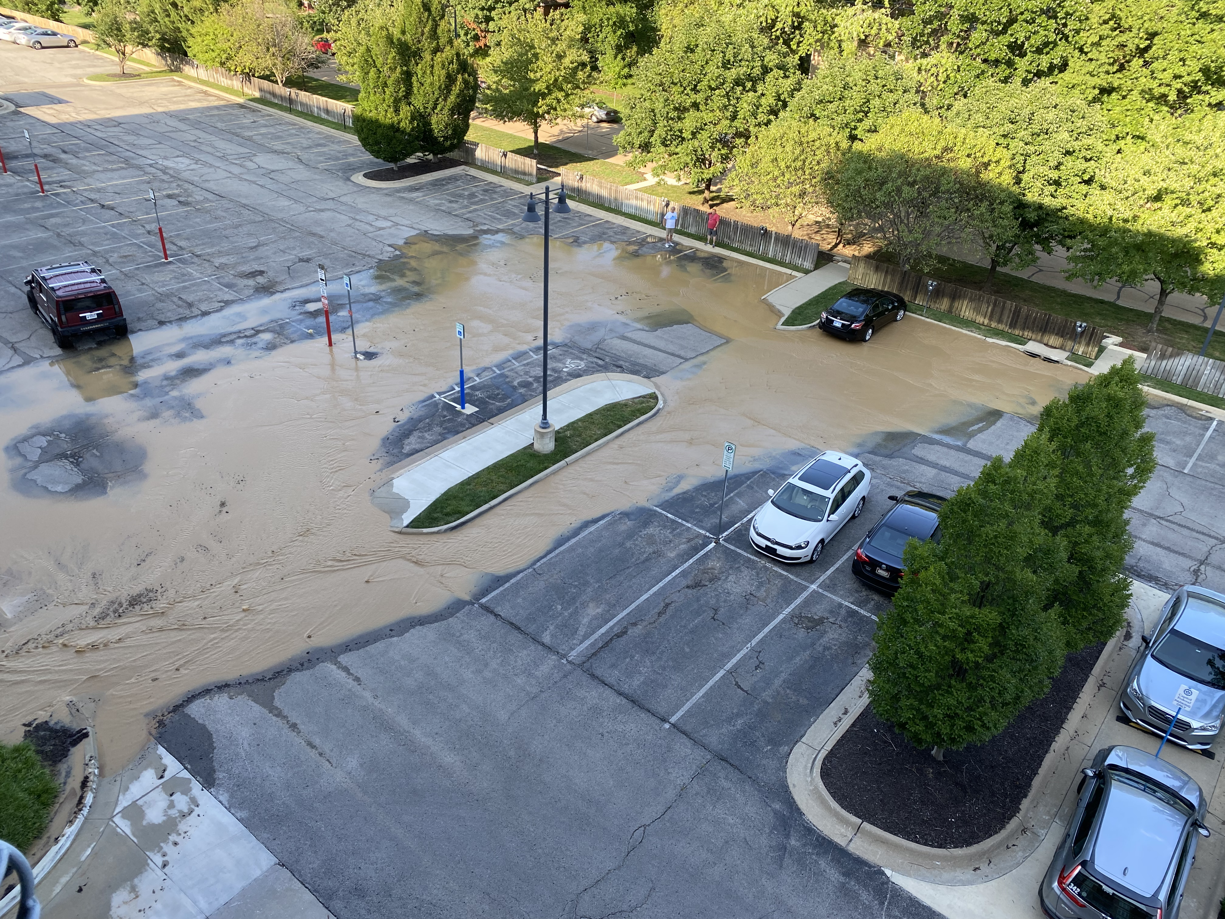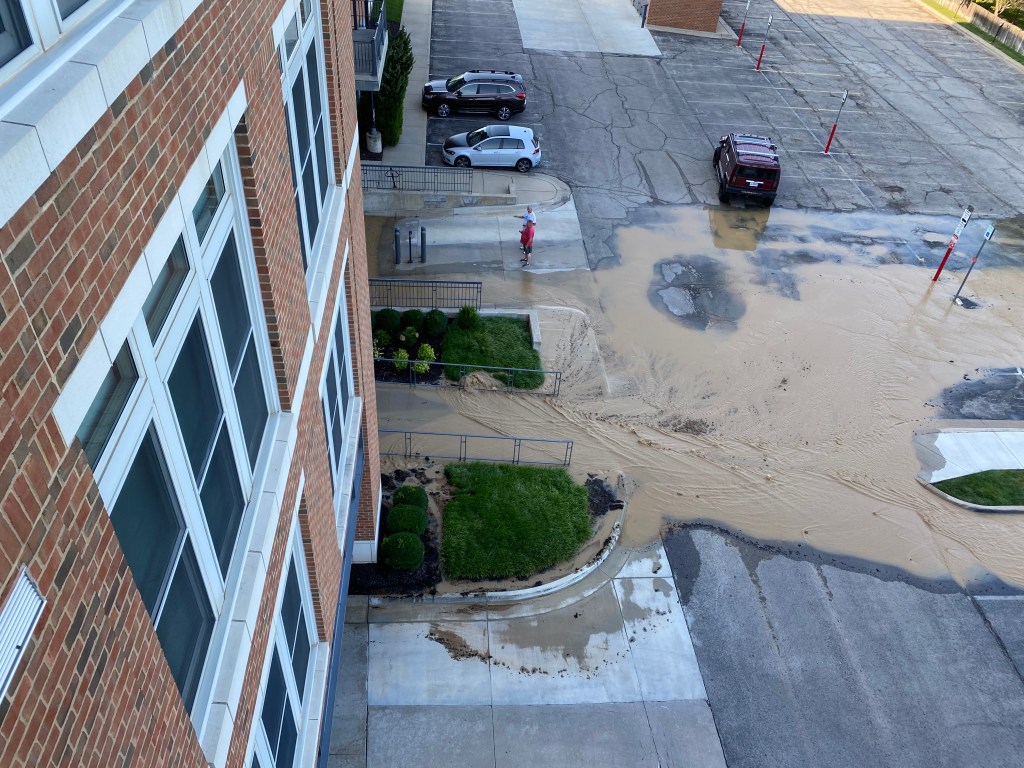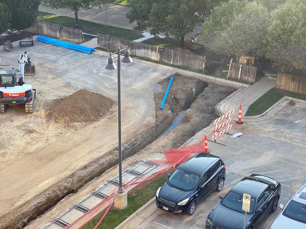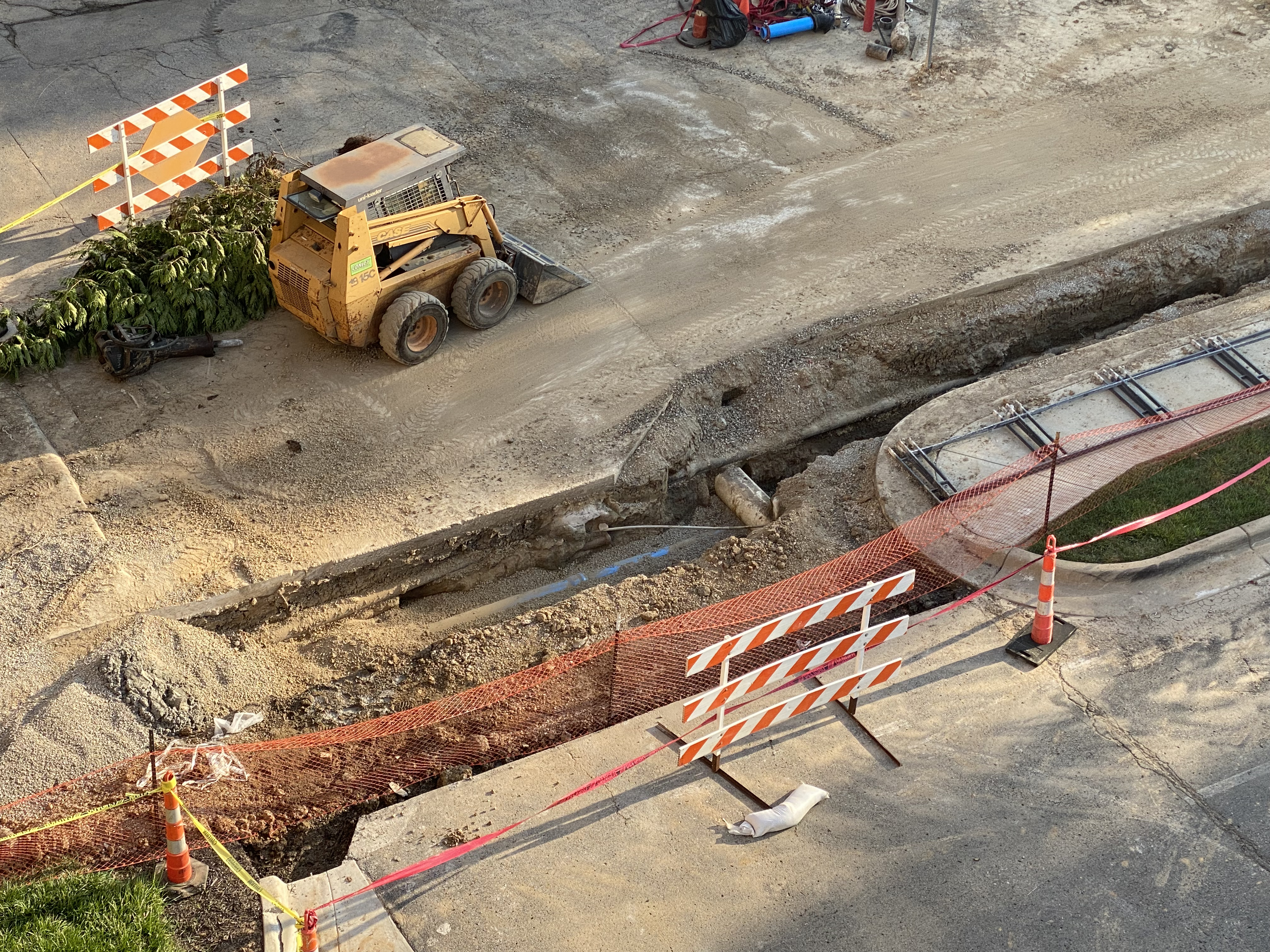 Saturday was a beautiful day so we spent a lot of it on the balcony. Sometime mid-afternoon, Kim said “What’s that fluttery noise I keep hearing?” And then he stood up, looked over the north railing, and muttered “Oh, shit. Oh, holy shit.” My ESPN told me right off we were in trouble but I didn’t know what I’d see down on ground level. Muddy water was gushing out of the ground on both sides of our entryway and from several spots in the parking lot, rapidly coating everything in its path with sand, clay, and silt. When I first looked over the railing I thought the water was pouring out of our lobby doors, and I could imagine it sluicing down the elevator shafts into the parking garage and storage cages, among other thoughts. Kim got our building manager here ASAP and it turns out it was the city’s fire line that broke, which isn’t good but does let us keep our house water on – fortunate, because this will take a while. There was a broken pipe earlier out by the street, so since yesterday we’ve had guys here running fun-size machinery to trench out the whole line, and Pa is entertained. Even with the jackhammering it isn’t all that loud, so we have to wonder how big a sponge the parking lot has become and we hope no one drops a backhoe into a sinkhole.
