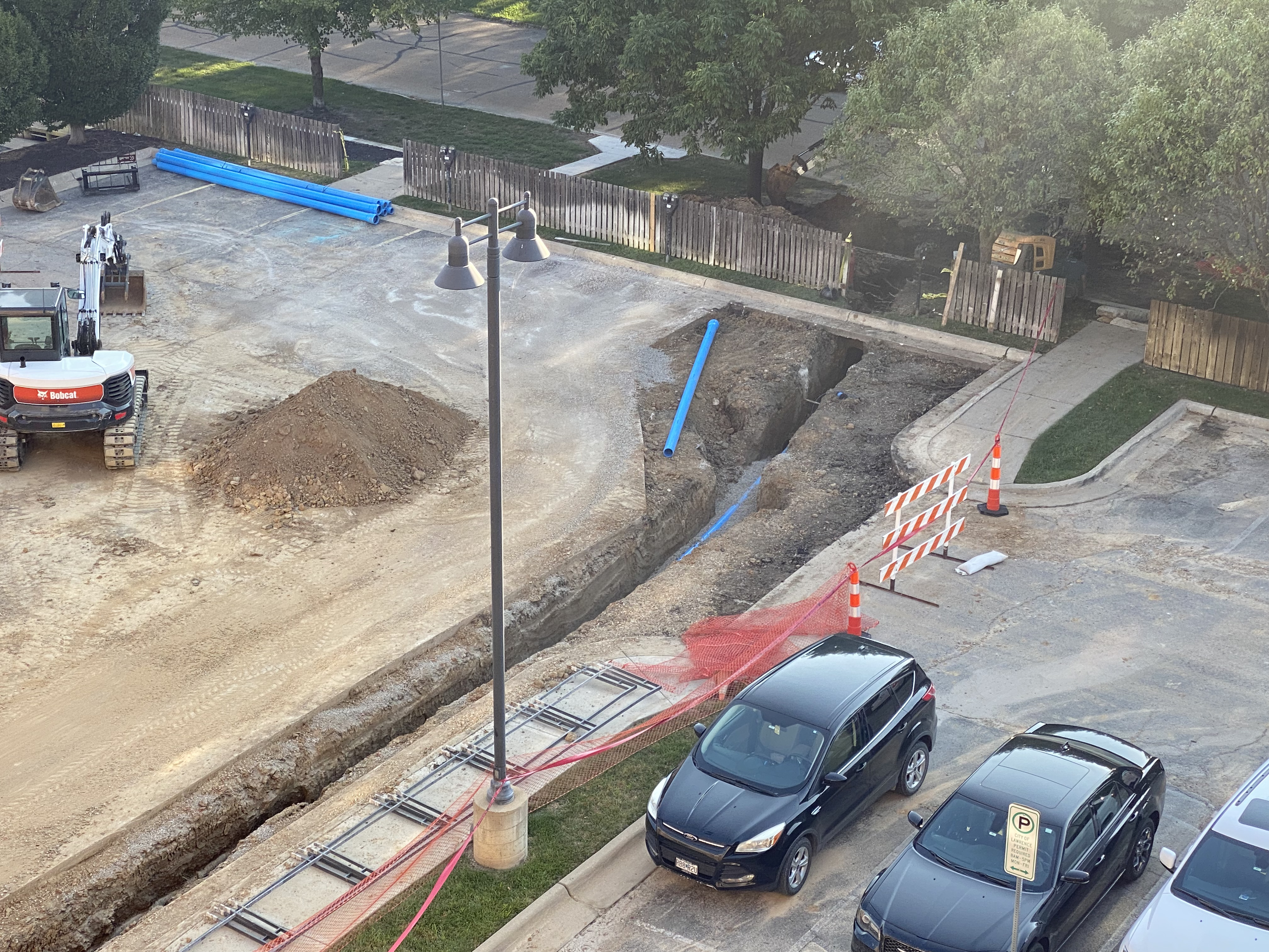 The entry’s boarded up like there’s been a bank robbery, and all the concrete has been dug out of the walkway, so progress. There are bad pipes in there somewhere, and something wonky out in the parking, so hey, free entertainment while it lasts…