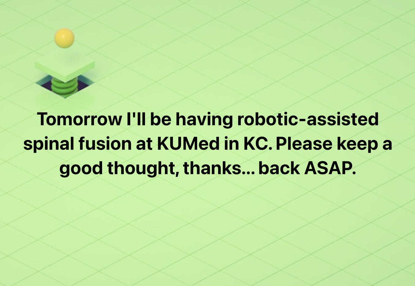 This fall, with things clearly falling apart in the pillar that holds me upright, Kim raised the ante and went in search of any helpful information available. A PickleBall friend told him about his wife, my age, who had robotic-assisted spinal surgery in Kansas City and is walking again without pain. Another PickleBall buddy told us about her own friend, my age, who had yet another KC surgeon do the same surgery, with similar positive results.