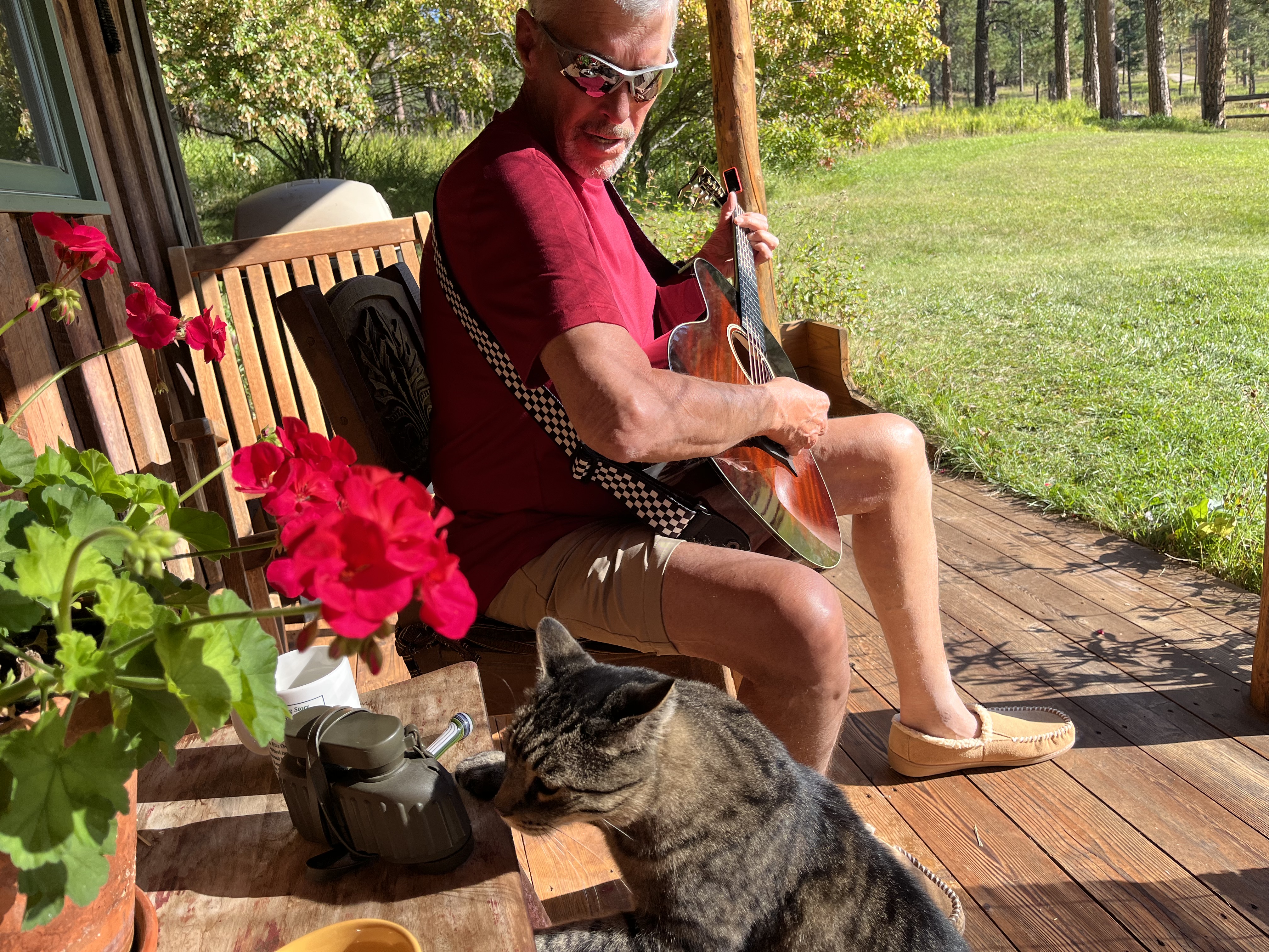Kim walked most of the ranch’s 30-acre property line and followed several of the trails that cross the terrain. He let that sweet Taylor guitar ring out across the meadow… and even wrote a song in his free time. He also cooked all our meals in the cabin’s perfect little kitchen. I read a little… wrote a little… napped a little… and far too soon it was time to pack up and point the car east. Fortunately, home is never the wrong place to be, and we were welcomed back this morning with a sky-blackening, crashing, booming thunderstorm, accompanied by pouring rain. Our place of choice still loves us, and likewise.