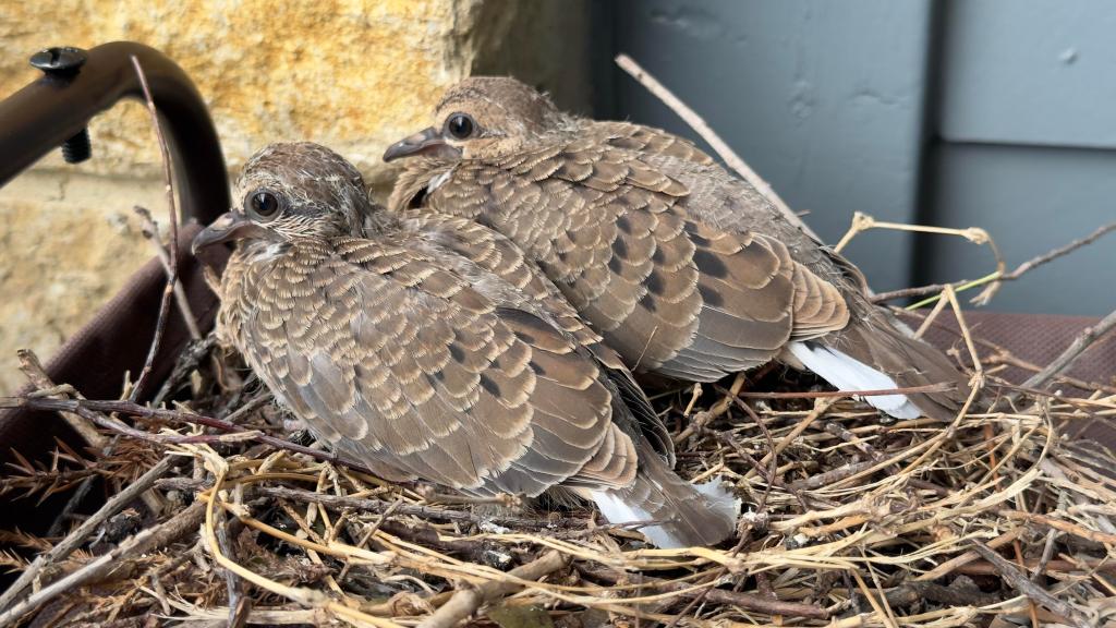 If you’re a regular here, you know that we hosted a mourning dove couple last spring and summer, watching them raise and fledge four sets of chicks. Kim named the parents David and Darlene Dove, and he subsequently gave monikers to each chick as they hatched. One set of babies was named Durwood and Donna, I remember. And then, right on schedule, D&D showed up here again in April this year and hatched Willie & SnoopDove… but lil’ Snoop failed to thrive. After that, D&D put one more set of eggs in the nest before they inexplicably disappeared, leaving the eggs to languish and making my Mama heart hurt.