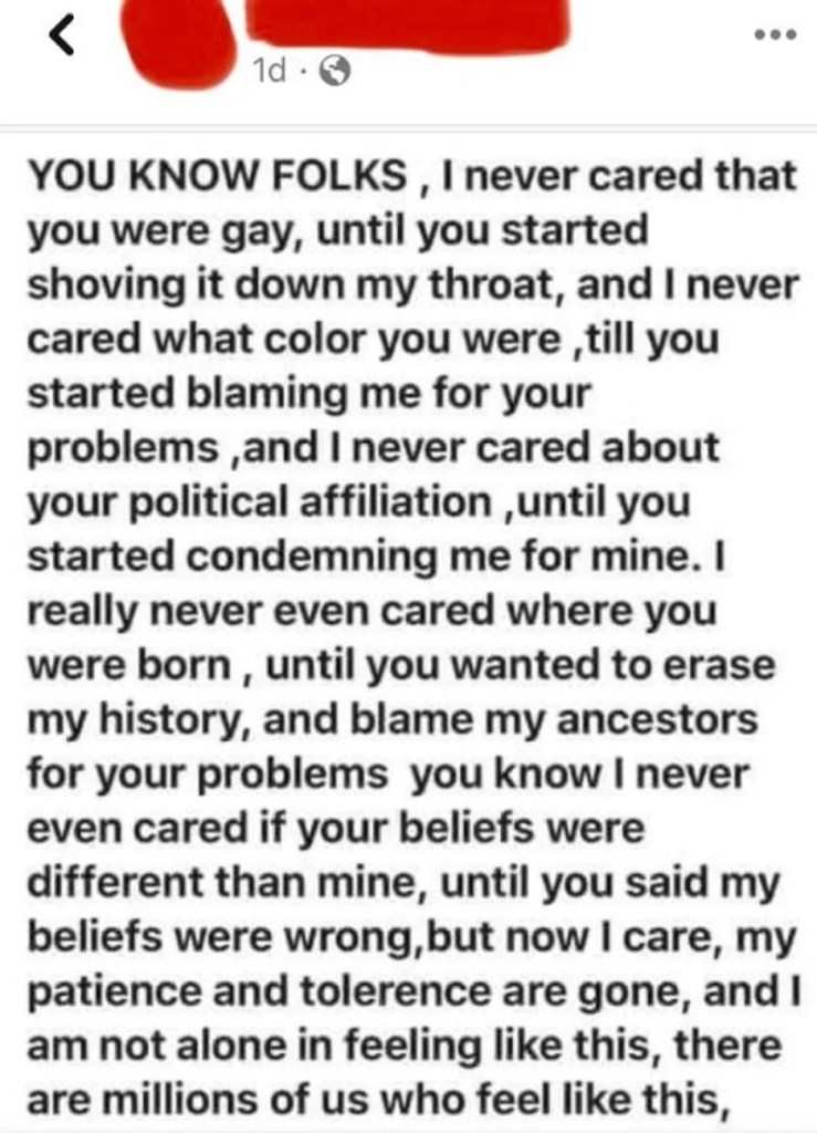 “And I know, I know that makes you really angry that I actually said it. That I won’t let you off the hook. We have a long history and you’ve made it clear I’m supposed to apologize for making you feel guilty with all my social media posts about my sadness and my anger. I should get over it already. Your guy won and you are such a nice person and how dare I…