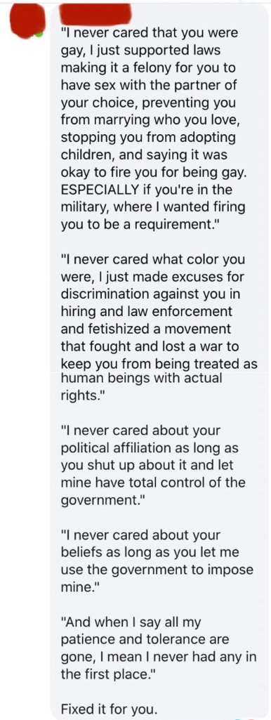 “By ‘okay’ I do not mean I forgive you or that we are cool. I mean, you have made a decision and I will react to it accordingly. Notice I didn’t say respect it. A blatant disregard for the well being of others is not worthy of respect. But I will acknowledge this is a choice you made and I will walk away.